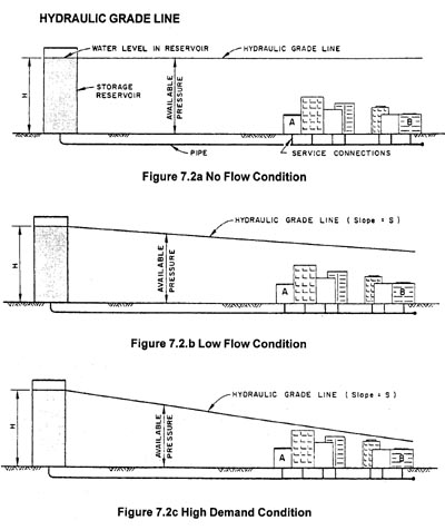 Hydraulic grade line is a hypothetical line used to indicate the relative elevation of the total energy head (of the water) at any point in the pipeline.The concepts of the hydraulic are illustrated in the figure below. Under no flow conditions, the pressure head available anywhere in the system equals the difference in elevation between the ground elevation and the hydraulic gradeline elevation. In the first part of the illustration, the elevation of the hydrulic gradeline is level because there is no flow in the pipe and therefore no frictional losses. The pressure available at houses A and B is equal. Under flow conditions, the hydraulic grade line slopes in the direction of the flow. For the low flow condition, the hydraulic grade line slopes moderately because the velocity in the pipe is low and the frictional losses are low. When the demand is high, the hydraulic grade line drops more rapidly because of the higher flow velocities in the pipeline. Available pressure is consequently lower at high flow because the elevation of the hydrulic grade line is lowered. ![]() |