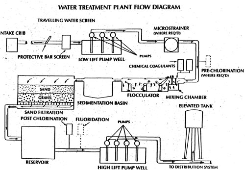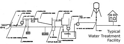 Water in the natural environment contains many contaminants which make it unsuitable for human consumption. These contaminants include pathogenic microorganisms, colour, odour, suspended matter and chemicals which either endanger public health, are unappealing to the senses, or casue engineering problems. Treatment processes remove or decrease the contaminant levels so as to make the water fit for human consumption. The process described below is a typical process used in Ontario when water is drawn from a relatively clean body of surface water. The figure below illustrates the flow of water through a treatment facility. Groundwater supplied systems may have simpler treatment facilities due to the quality of the source water. ![]() Raw water will contain small particles, known as colloids. These colloids produce a cloudy appearance known as turbidity. Turbidty can shield microorganisms from disinfection. Colloidal particles either do not settle or are very slow to settle. For this reason chemcials are added which will react with the colloids and the water to form relatively large, easily settleable particles. The mixing of these chemicals (coagulants) with the water is known as coagulation.The reaction between the coagulant and the particles is very fast and thus the chemicals must be mixed quickly and thoroughly in the water to assure that it has achieved maximum effect. For this reason the process is called rapid or flash mixing.The most commonly added chemical for this purpose is aluminum sulphate (Alum). Ferrous sulphate, ferric sulphate and various ploymers are also commonly used coagulants. The water then passes into a flocculation tank. In the flocculation process the water is mixed slowly and the particles (floc) build in size and density. The purpose of flocculation is to achieve optimum size particles which will readily settle out of the water. The addition of too much or too little coagulant decreases the efficiency of the treatment process. For this reason it is very important to determine the correct dosage. The optimal chemical dose is determined in the laboratory using a "jar test" which simulates the conditions in the plant on a small scale. From this point the water normally flows into sedimantation tanks (or clarifiers) wherein the heavier matter settles due to gravity. The time the water remains in these tanks is known as detention time. The settled material is usually disposed of in the sanitary sewers. Surface waters may also require a pre-sedimentation period, before any other treatment process in order to remove very large material, such as sand and organic debris. The next step in the process is filtration. Removing as much suspended particles as possible is very important for the operation of a treatment facility. Not only will the water appear clean to the consumer, but removing suspended particles eliminates the possibility of dangerous bacteria being protected from the disinfection process. The most common type of filtration process is known as the rapid sand filtration. Although there are various types of various sand filters, most operate using the same general principles. These filters normally contain layers of anthracite, sand, and/or gravel. The tiny pore spaces in the filter "media" trap the suspended particles. Most matter which has not settled in the flocculation tank is entrapped by the filter media. Activated carbon may also be used to remove taste and odour problems. The quality of the water, as it leaves the filtration process can be determined by its turbidity. High tubidity may indicate that the filters require cleaning. Filters are cleaned on a regular basis (usually 1-4 days depending on the facility) by a process known as backwashing. During this process the normal water flow is shut off and fully treated water is pumped up, backwards, through the filter media to remove the entrapped matter. The backwash water will be further treated to remove the solids or routed to the sanitary sewer. Before the water is distributed to the community one or more chemicals may be added to help disinfect, adjust pH, or remove other impurities. The most common addition to chlorine, used, primarily, to kill harmful microorganisms in the water. Chlorine, when used as a disinfectant, is added after solids removal but at a point which will allow complete mixing. It is necessary to ensure that the chlorine has sufficient time to react with the water and the microorganisms (this period of time is known as the chlorine contact time). For this reason, the water and chlorine willbe allowed to react in a chlorine contact chamber or clearwell. In this chamber the chlorine residuals are raised to the required standards. Other disinfection methods such as ozonation and ultraviolet radiation (UV), are also used. Taste and odour in drinking water is a common consumer complaint. By themselves taste and odour do not cause any health problems. To encourage consumer usage it is important for treatment facilities to minimize their impact. Several methods are in common use to combat taste and odour including aeration (i.e. mixing air in water), addition of chemicals such as chlorine or potassium permanganate, and the use of activated carbon. Generally, water of high oxygen content and low temperature produce a superior tasting water. Other compounds such as iron and manganese may also be treated if their concentration is too high. The most common methods of treatment are aeration, chlorination, addition of chemicals or ion exchange. Many treatment systems will also add fluorine to the water to prevent tooth decay. Chemicals may also be added to adjust the pH of the water. pH adjustment is often necessary to optimize the coagulation process. Waters which are corrosive in nature may also be treated chemically before distribution. After the water is treated it flows to a large tank, normally called a clearwell or chlorine contact chamber, where it is pumped to the distribution. ![]() 
